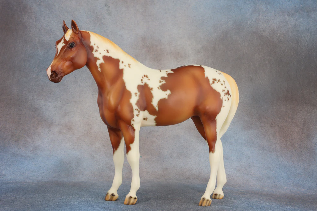 Spinabbey belong to Guy McLean, he has had another horse made by Breyer which was Nugget and his training videos were apart of an auction lot. According to Guy, Spinabbey was more like a gazelle in his first days. He'd keep all fours off the ground and has now become the lead horse in his performances. He can canter sideways and backwards!! Spinabbey's mane is roaches and will come with a poem from Guy.